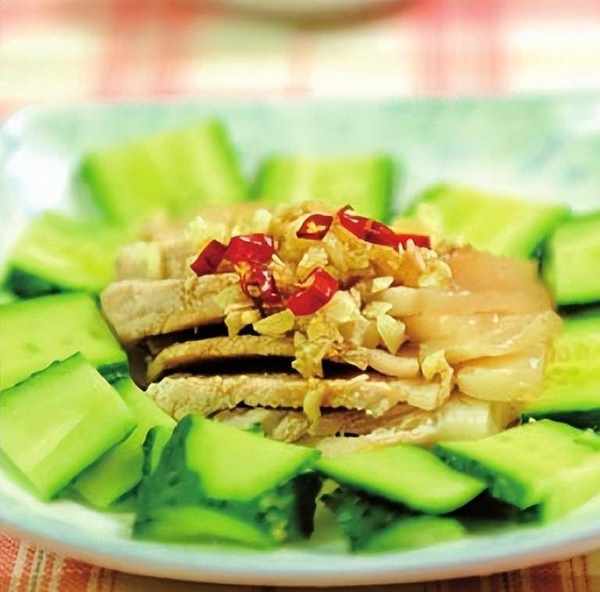 3.將肉撈出,瀝幹水分,片成薄片,和黃瓜片一起拼盤,加蒜泥、辣椒油、雞精、蔥花拌勻即成。