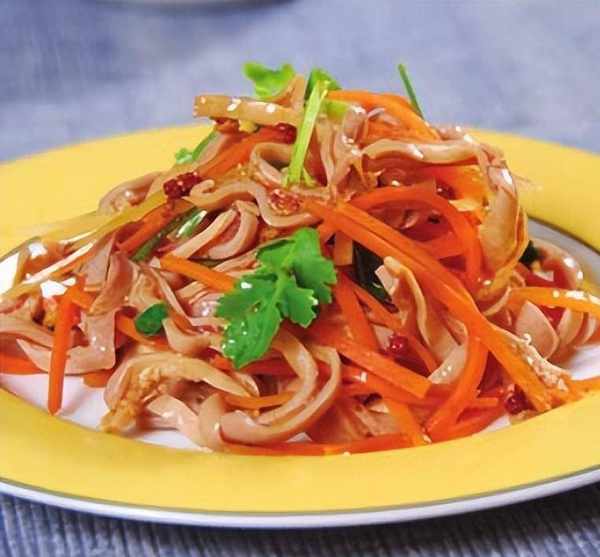 做法:1.將熟豬肚洗凈切絲;香菜洗凈切段;胡蘿卜洗凈切絲。