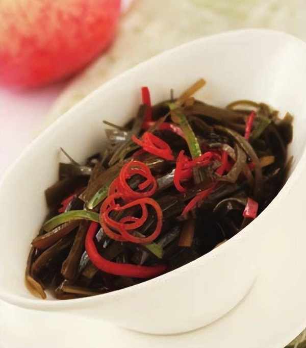 原料:海帶 30 克,青椒、紅椒各 1 個。
