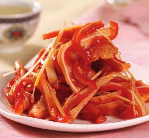 做法:1.豬耳朵洗凈,汆燙後撈出,用刀刮凈外皮上的油垢;鍋內加清水及料酒,將豬耳朵煮 20 分鐘至熟後撈出,斜刀片薄,再改刀切絲。