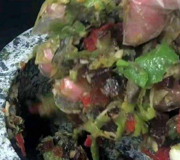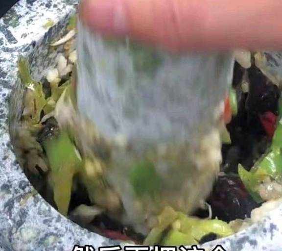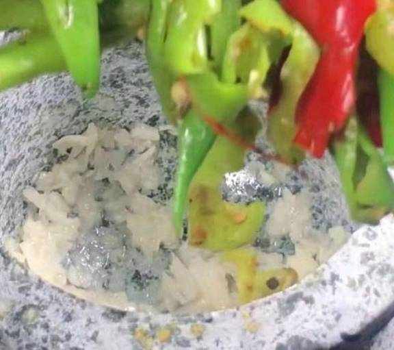 3、制作這種擂椒皮蛋蒜末也是必不可少的,找一個幹凈的蒜罐子徹底清洗幹凈。將蒜末放入搗爛成泥,然後放入少量食鹽,把炒好的辣椒也一起放入,用蒜錘輕敲幾下,不要把辣椒搗爛,分成小塊即可。