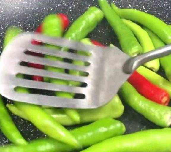 2、其次便是辣椒的制作,需要經過一些特殊的處理,將杭椒和美人椒徹底清洗幹凈控幹水分。準備一個鐵鍋,將鍋置於火上微微燒熱,然後把辣椒放入鍋內用鏟子一遍炒一邊打,看到辣椒半熟,放少量食鹽進入。隨後再次開小火煸炒,直到辣椒微微發糊即可。