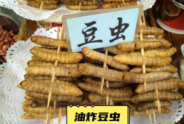 油炸豆蟲,開始其取材僅僅為豆蟲,許多人看著那以黃綠色的、一節一節的蟲子表示難以下口。但油炸豆蟲不知從什麼時候起變得奇怪起來,油炸螞蚱、油炸蚯蚓甚至油炸蠍子蜈蚣也紛紛加入進來。因此也有許多人因為其足夠獵奇而更想嘗試一番。