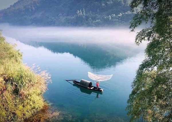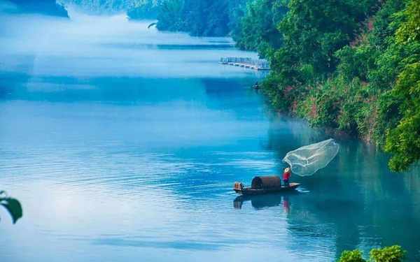 霧氣升騰的江面迷蒙得恍如仙境,漁人擼槳劃舟,到江中揮手將漁網往外撒出,一派祥和的漁牧之景,這裡就是郴州小東江。