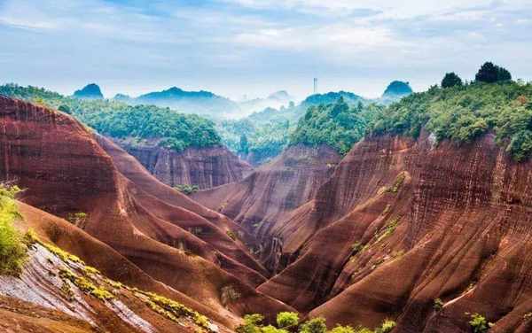 不同於別處,高椅嶺丹霞地貌周邊有漂亮的水窪點綴,從高空俯瞰,每座山就像是一座島嶼,鑲嵌在寶石般碧藍的水中。