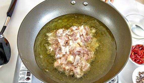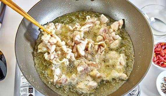 4.鍋中倒油燒至三成熱,下入雞丁,等漿稍微凝結之後再慢慢攪拌,讓雞丁在溫油當中養熟。