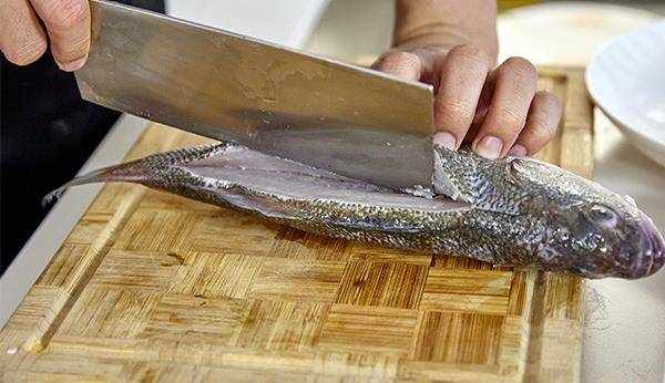2.順著魚的脊背,貼著骨頭一直片到裡面,深度大概是一節手指。翻面在脊背改一字刀口,切刀骨頭 但不要切到腹部。