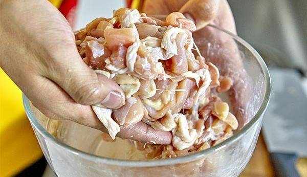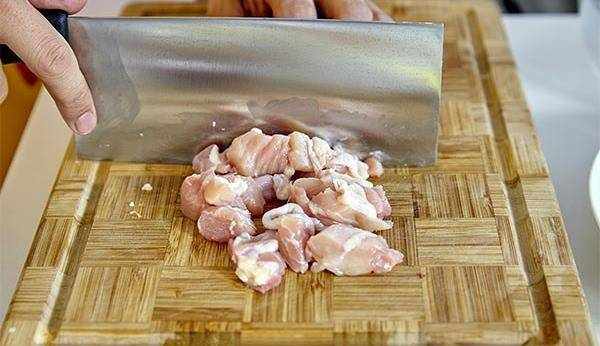 將去骨的雞腿肉切成拇指蓋大小的丁,放入碗中