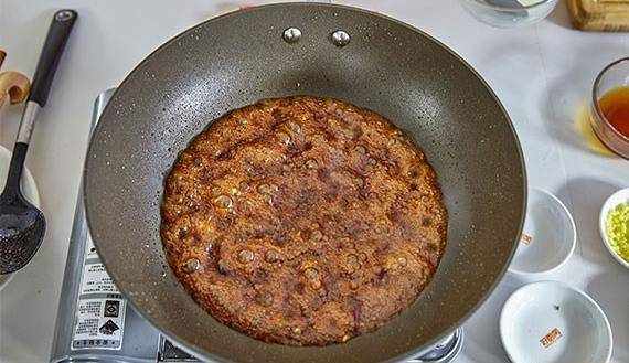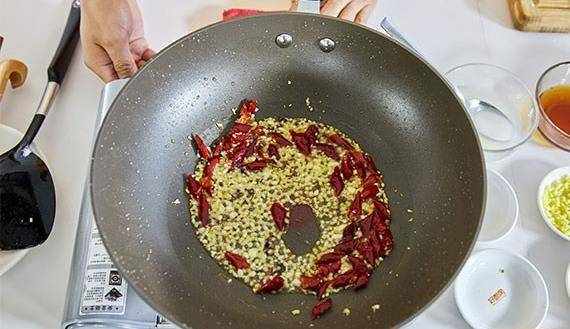 6.鍋中留半勺底油,下入蒜末、薑末,花椒粒,幹椒結煸炒。