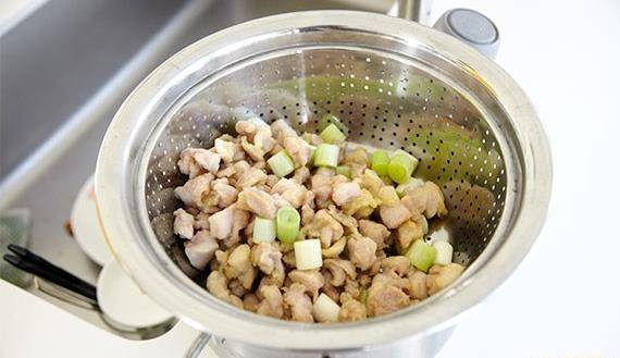 5.將蔥段,倒入油鍋中和雞丁一起浸炸,大約二十秒左右,將雞丁和大蔥撈出控油。