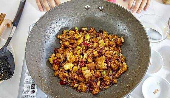 8.熬至湯汁粘稠之後,倒入剛才滑好的雞丁和大蔥結,撒入部分去皮花生,翻炒均勻,將湯汁包裹在雞丁上面。