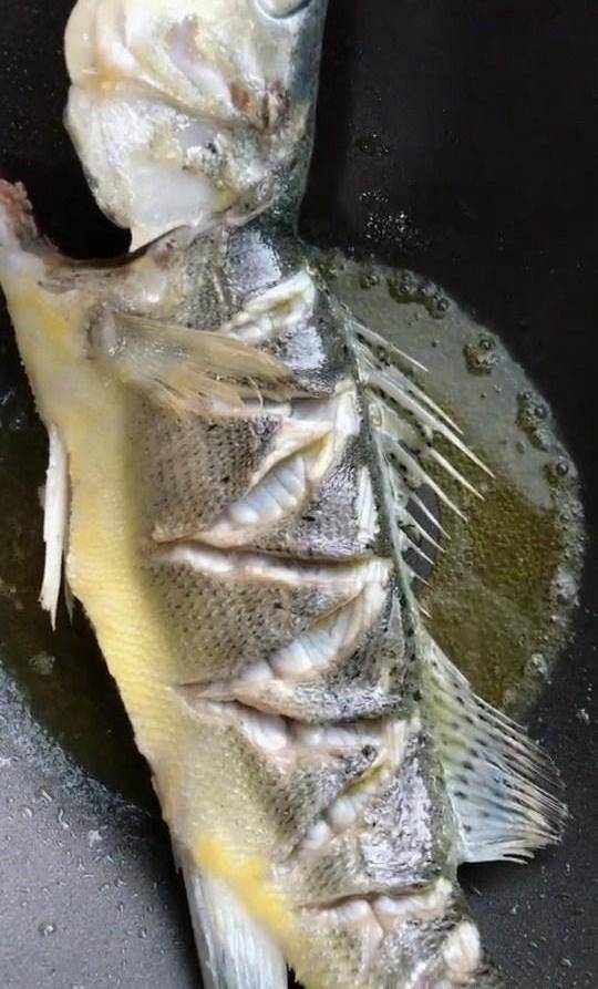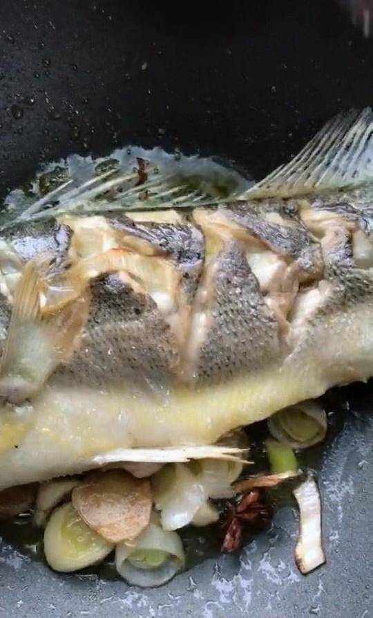 海鱸魚下鍋,將海鱸魚兩面煎一下