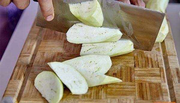 3.浸炸土豆的同時,把茄子去皮切成滾刀塊,青椒切成三角塊。