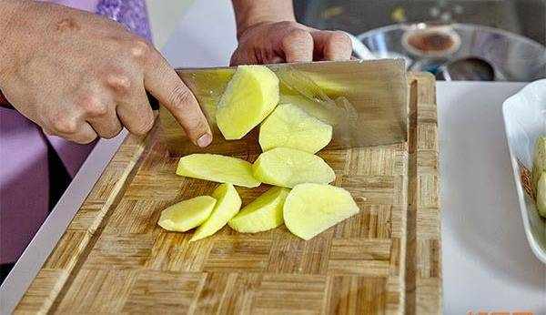 1.大蒜切末,調制一碗水淀粉,蔥、薑切好備用。土豆去皮改刀,切成橘瓣狀,切的要薄一點,目的為得是為瞭讓土豆容易成熟。