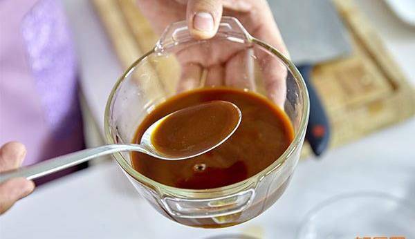 7.這時可以調制一個碗汁,在空碗中加開水一大勺、料酒一勺、蠔油半勺、鹽半勺、白糖一勺半、雞精半勺、醬油一勺、老抽一勺、水淀粉兩勺,充分攪拌均勻即可。