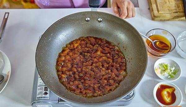 9.鍋裡留少許底油,下入蔥、薑爆香,然後把調好的碗汁倒進鍋裡。