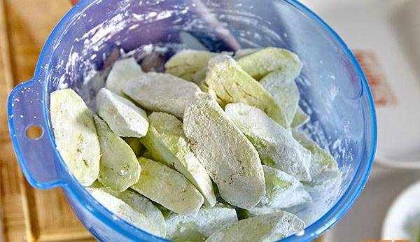 4.接下來把茄子倒入一個空盆中,加玉米淀粉,抓勻讓茄子掛上一層薄薄的淀粉,茄子就不會吸太多油。