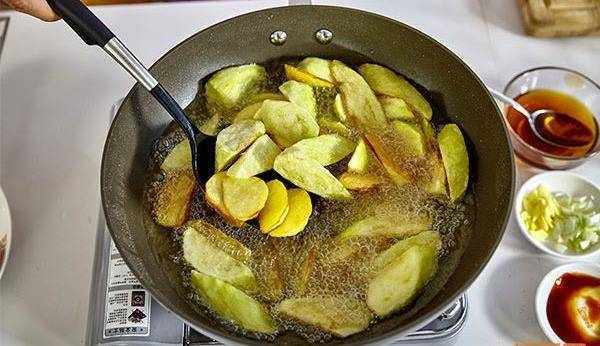 6.等油溫到六成熱時,再下入拍好粉的茄子浸炸,當茄子漸漸上色後,下入土豆,一起炸制。