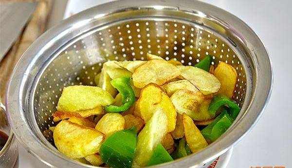 8.茄子土豆已經變成金黃色後,下入剛切好的青椒,翻炒幾下,就可以倒出所有食材,瀝幹油漬。