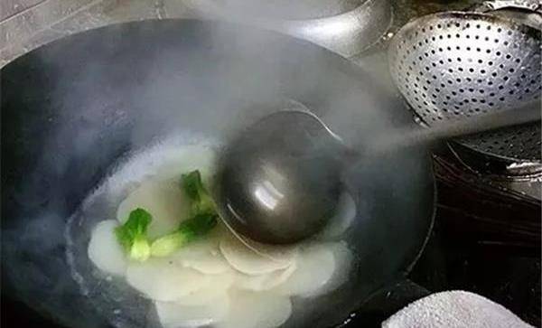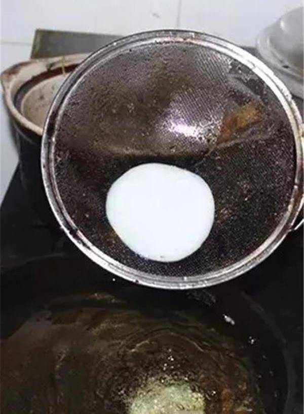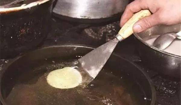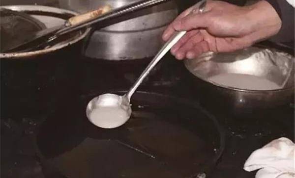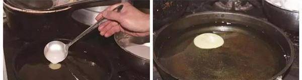 2、向鍋裡舀糊的操作步驟看似簡單,實際上超難。舀起魚糊的勺子需緊貼油面(不能高於1厘米),往鍋中對準一個點倒,力道均衡,不要忽多忽少。將一勺糊均勻地倒在該點上,這樣魚糊才能勻速擴散,變成圓片。