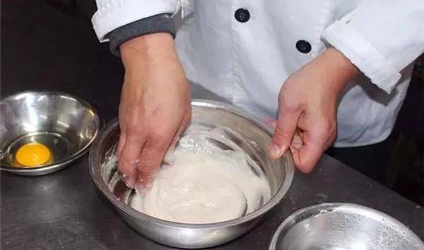 2、取100克魚泥納入盆中,加蛋清3個、清水400克、水淀粉25克、鹽8克、味精5克,朝同一個方向攪拌均勻成稀糊,至能呈直線狀下落為宜。