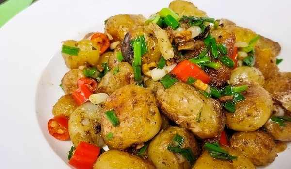 4、接著起鍋燒油,把小土豆倒進去,慢慢地煎。中途加入一些蒜末和辣椒繼續翻炒。