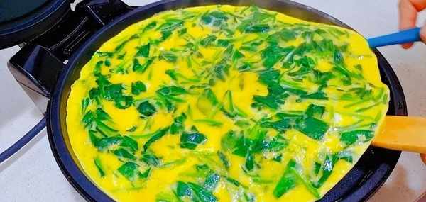 3、之後起鍋燒油,鍋熱瞭,就把菠菜蛋液倒進去慢慢的煎,等差不多熟瞭,就用勺子或者鏟子,慢慢地把它卷起來,然後再弄出來放到盤中,大傢吃的時候可以整塊,也可以切一切。