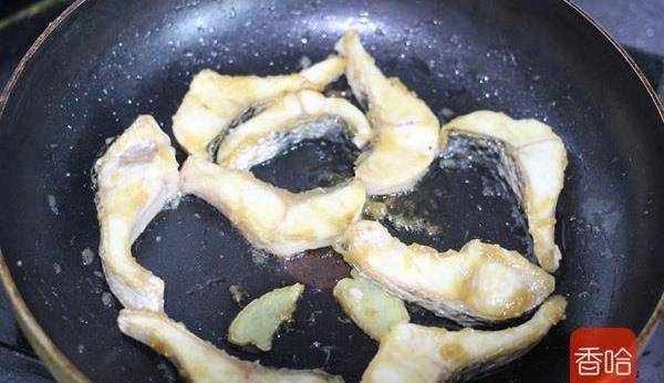 5.平底鍋用薑擦背,熱鍋倒入涼油,放入醃制好的魚塊煎至兩面金黃即可