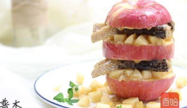 10.取另一個切好的蘋果擺盤,一塊蘋果上先放入剩下的蘋果丁,再放入兩塊魚,再放入一塊蘋果,以此類推,再用薄荷葉點綴即可