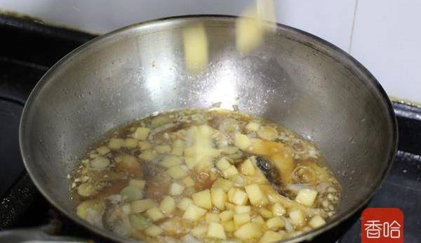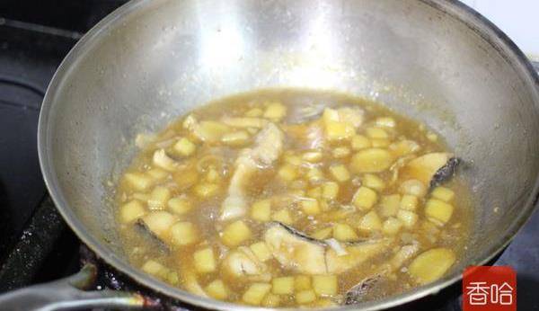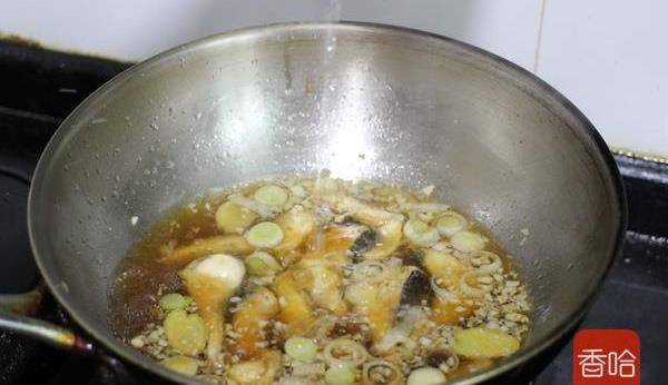 7.炒出蒜香味後,倒入料酒,少許生抽,醋,糖和魚塊和適量清水,大火燒開轉小火燉10分鐘