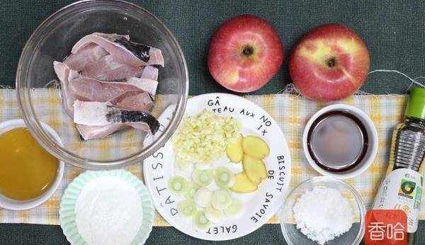 1.準備好食材,黑魚提前切好去黑膜,清洗幹凈,薑切片,蒜切末,大蔥切片,蘋果洗幹凈