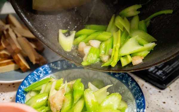 6、接下來就是將炒制過的芹菜重新倒入鍋內和瘦肉混合入味,快速地翻炒一會,瘦肉和芹菜不需要長時間地炒制,容易老。