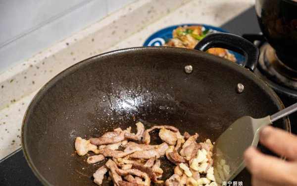 5、油鍋可以不用洗,利用底部的多餘豬油繼續煸炒瘦肉,當瘦肉表面焦黃,加入蒜末一起煸香。
