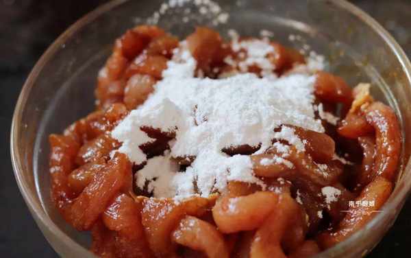 可以去腥也是給瘦肉補充水分,當瘦肉吸滿汁水後,放入少許醬油、蛋清和淀粉調味並鎖住水分,加固嫩肉口感。