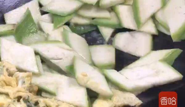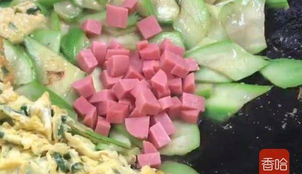 7.再加入火腿丁,同雞蛋、絲瓜一起翻炒片刻