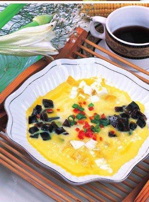 3 鍋內加入豬油燒熱後下入魚丁、香菇丁、玉米粒、枸杞炒拌均勻,加入鮮湯、精鹽、味精略燒入味,勾芡,撒蔥花,澆在蒸好的雞蛋上即可。