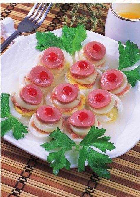原料:雞蛋 8 個,菜膽 12 個,紅椒末 1 克。