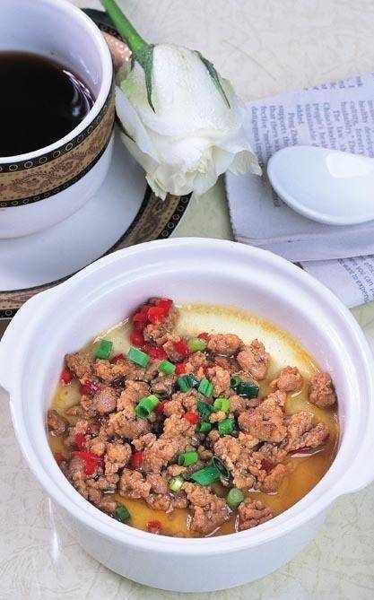 2 將雞蛋打入碗中,用筷子攪散,放鹽、味精,加適量冷鮮湯後再次攪勻,將肉末放入蛋液中,入籠蒸,上汽後蒸 10 分鐘至熟後取出,淋香油、生抽,撒蔥花即可。