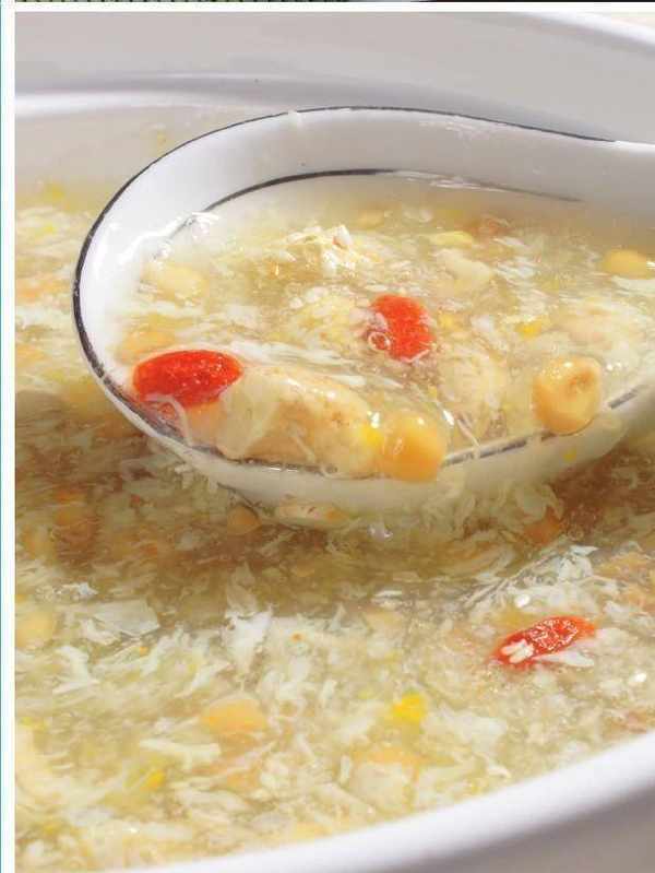 原料:雞蛋清 3 枚,熟玉米粒 10 克,枸杞子 5 克,白芝麻 5 克。