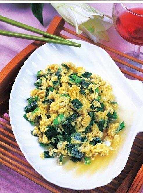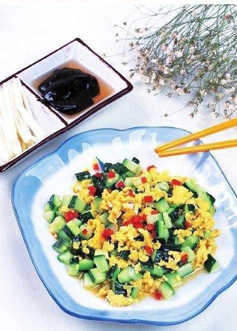 3 鍋置旺火上,放植物油,燒至七成熱,下入薑末煸香,再下入黃瓜丁翻炒,放鹽、味精、雞精,炒至黃瓜丁轉色後倒入蛋液,放剁辣椒,翻炒至蛋熟即可。