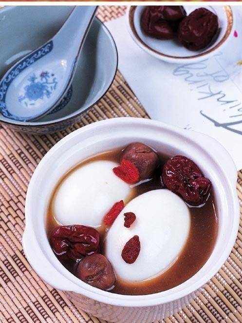 原料:土雞蛋 5 個,紅棗 10 粒,桂圓肉 25 克,枸杞 3 克。