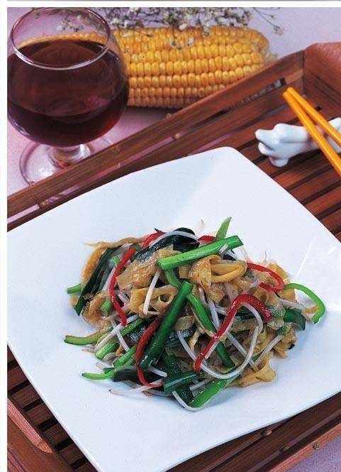 4 凈鍋置旺火上,放植物油,燒熱後下入薑絲、綠豆芽、韭菜,放鹽、味精拌炒,隨即下入蛋皮絲、蔥段、紅椒絲炒勻,淋香油,出鍋裝入盤中。