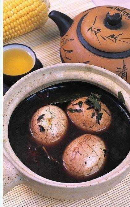 2 在大沙缽內放冷水,放鹽、桂皮、八角、幹紫蘇蔸、五香粉、茶葉,在旺火上燒開,放入破殼雞蛋,改用中小火煮至雞蛋入味上色,即成。