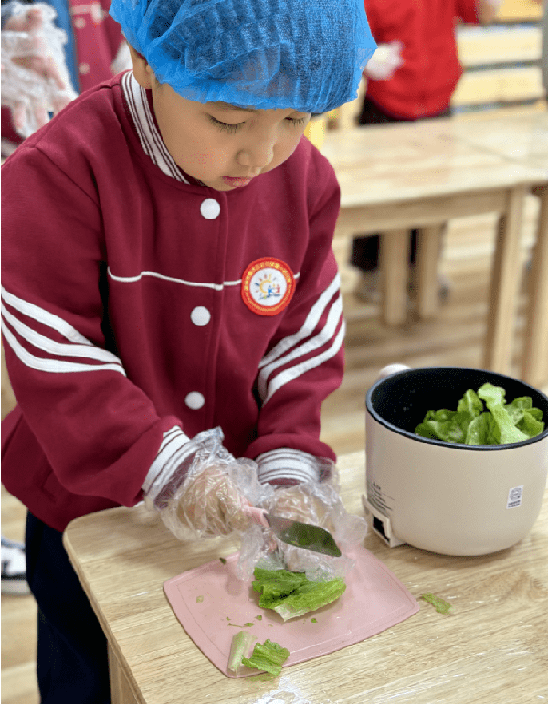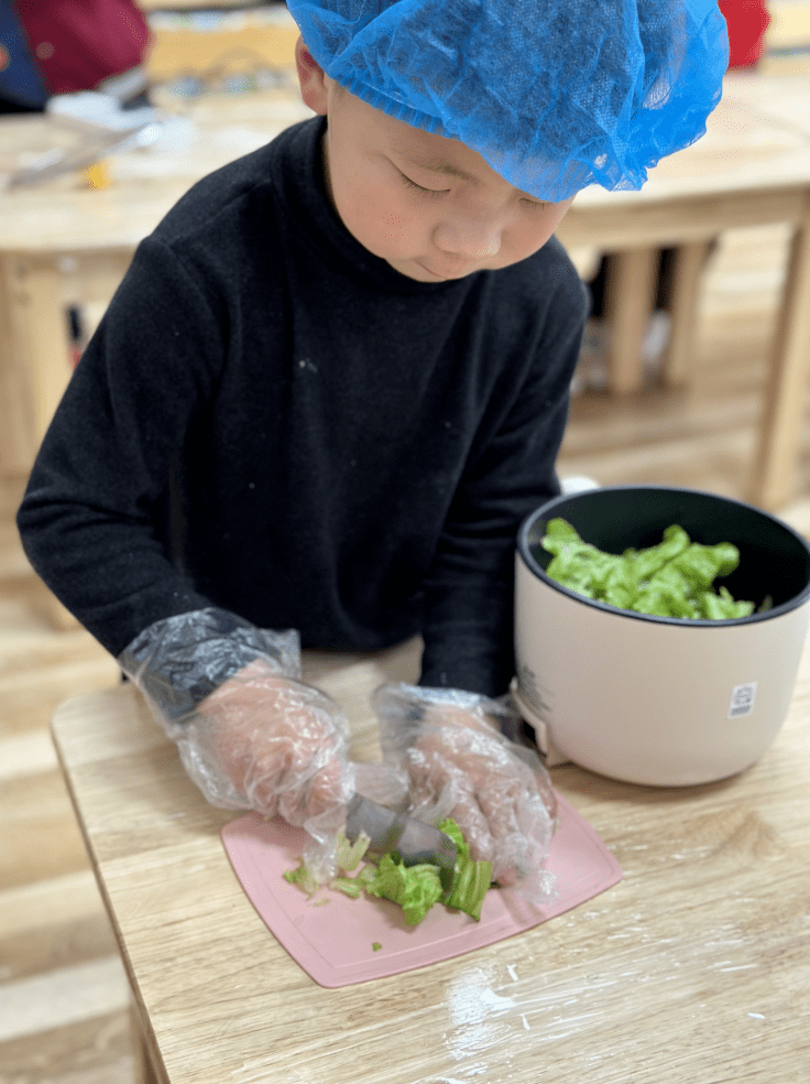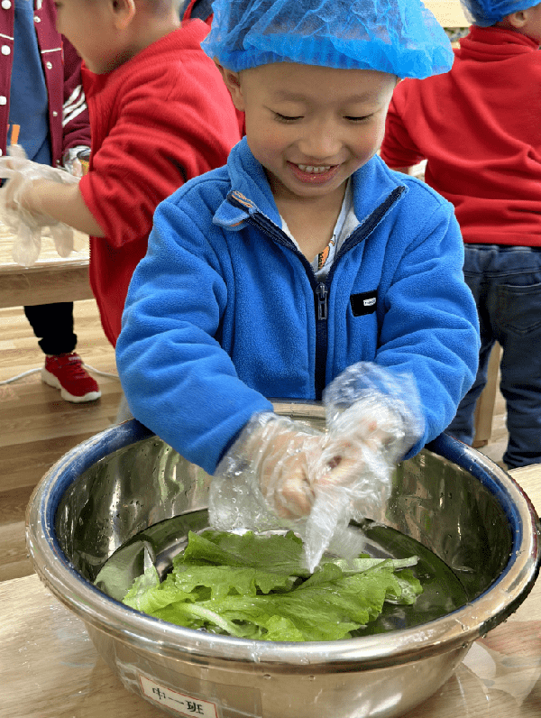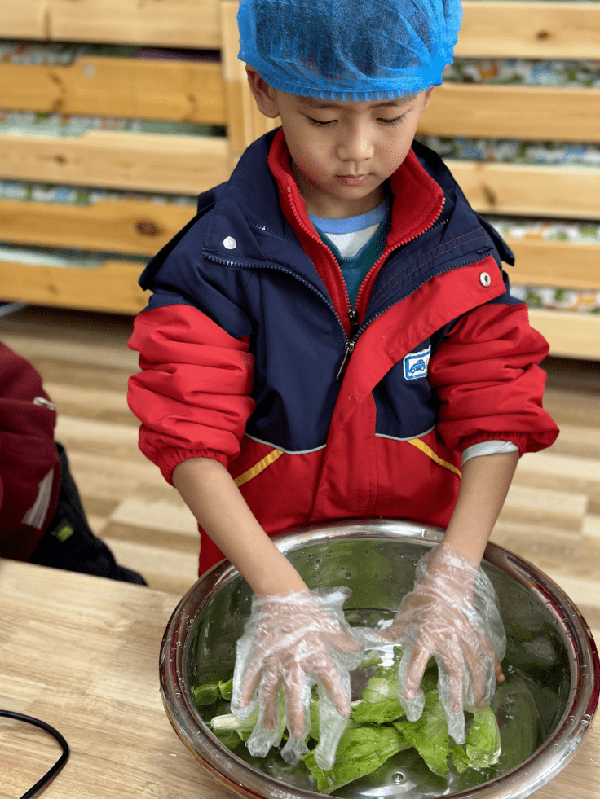 “切菜組”的孩子們用塑料小刀將洗凈的生菜切成細絲……孩子們分工明確,互相配合,認真地完成著自己的工作。看著這些能幹的“小廚師”們,讓人不禁為他們豎起大拇指!