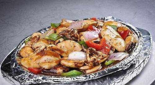 鐵板黑椒燒燈魷:爐子上放一塊鐵板燒的滾燙,接近冒煙,用夾子取下放到木板上,均勻的鋪上洋蔥絲,倒入魷魚圈,澆上黑椒汁,撒上蔥花即成。認為這道菜肴還可以的可以分享給朋友們!