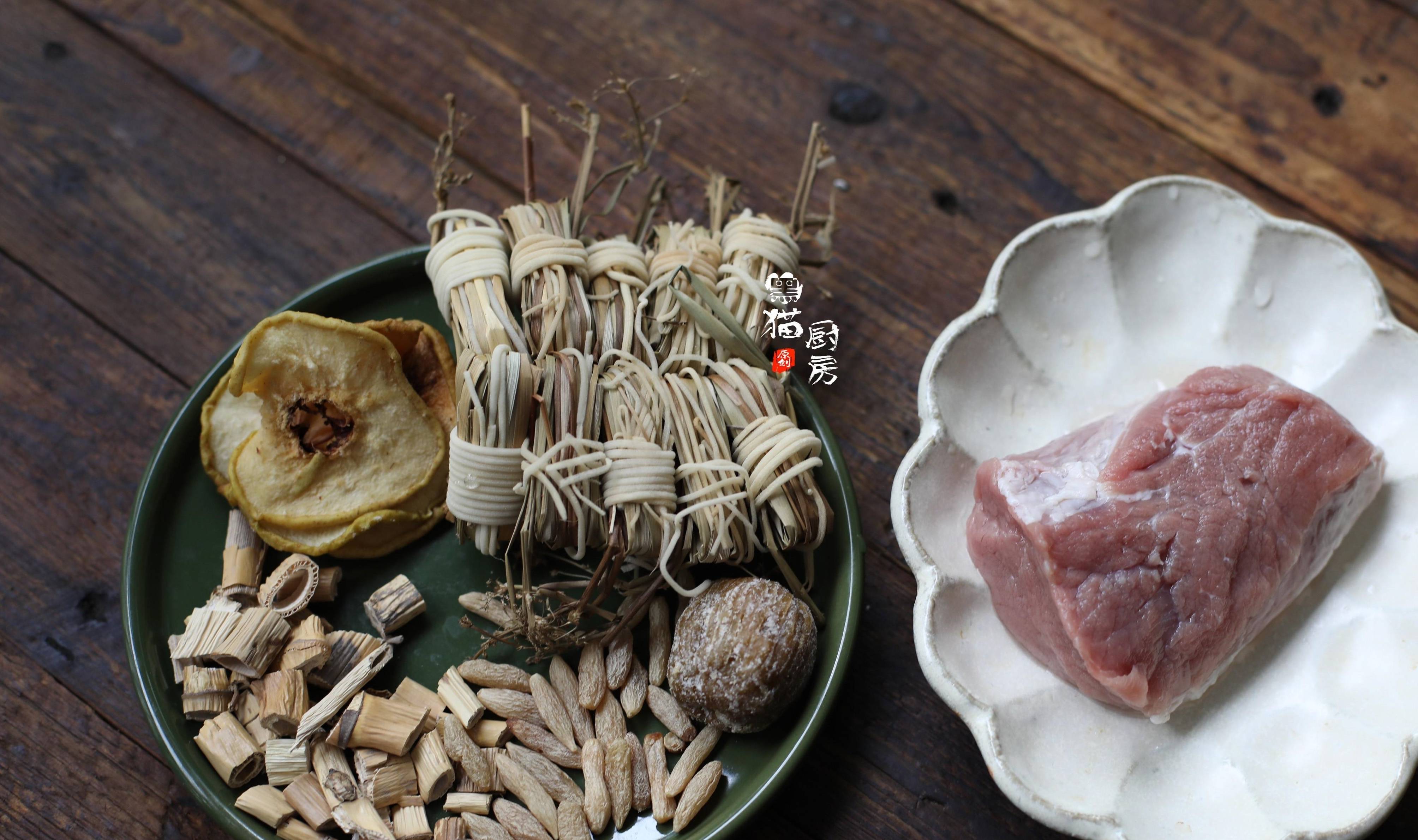 1.準備湯料。雪梨幹我傢常備,每年秋天雪梨大量上市的時候我就會買上一些,把它們用烤箱烘烤成雪梨幹,煲湯放幾片,增加不少甜味和清潤的口感。其他湯料在湯料店裡都能買到。