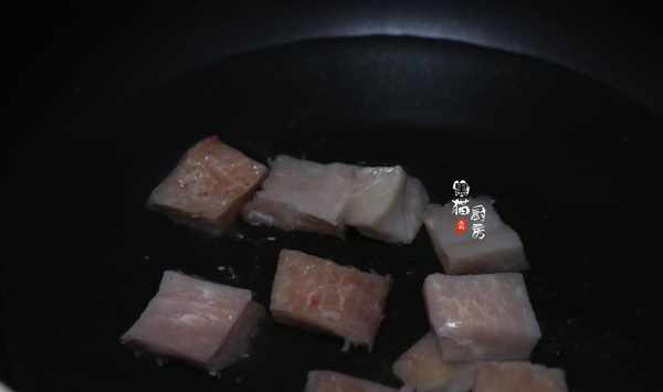 3.瘦肉切成塊,放入冷水鍋中,大火煮沸後汆燙1分鐘撈出。所有煲湯的肉類食材,煲湯前盡量汆燙一遍,能去掉表面雜質和血水等,去掉腥味。