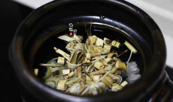 2.把蘆根、燈芯草和麥冬用清水淘洗幾遍,一般隻需要洗去表面的浮塵即可。