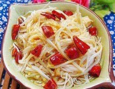 材料:金針菇300g、油適量、鹽適量、生抽適量、白砂糖適量、幹辣椒適量