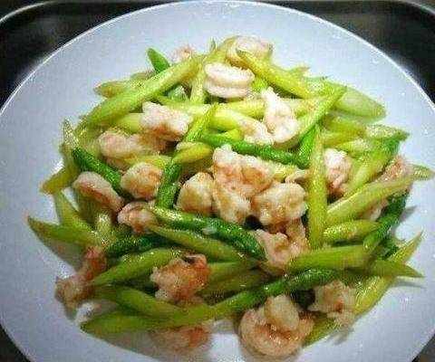 3、加入蘆筍煸炒後,再加入蝦仁和炒菜炒至六或七點鹽,繼續炒雞肉。